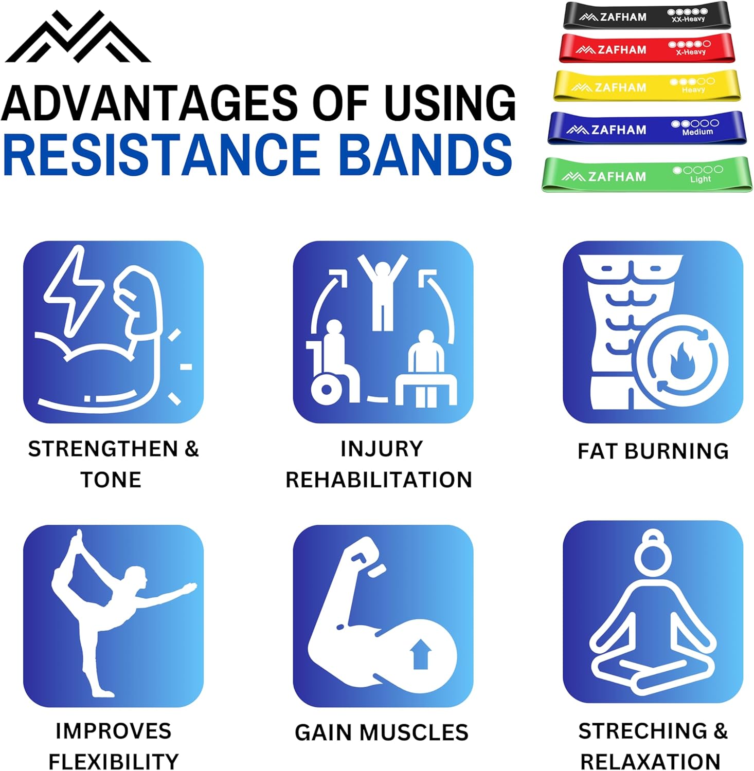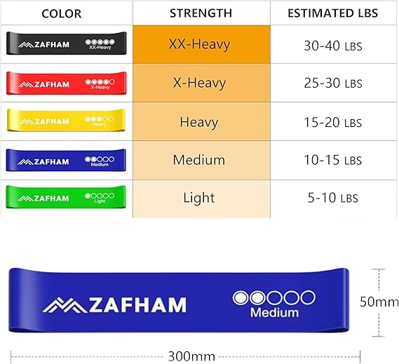• 🎯 5 Color-Coded Resistance Levels Each band is clearly color-coded and labeled (Light to XX-Heavy), so you can easily find the perfect level for warm-ups, intense workouts, or recovery sessions. One set, unlimited possibilities.