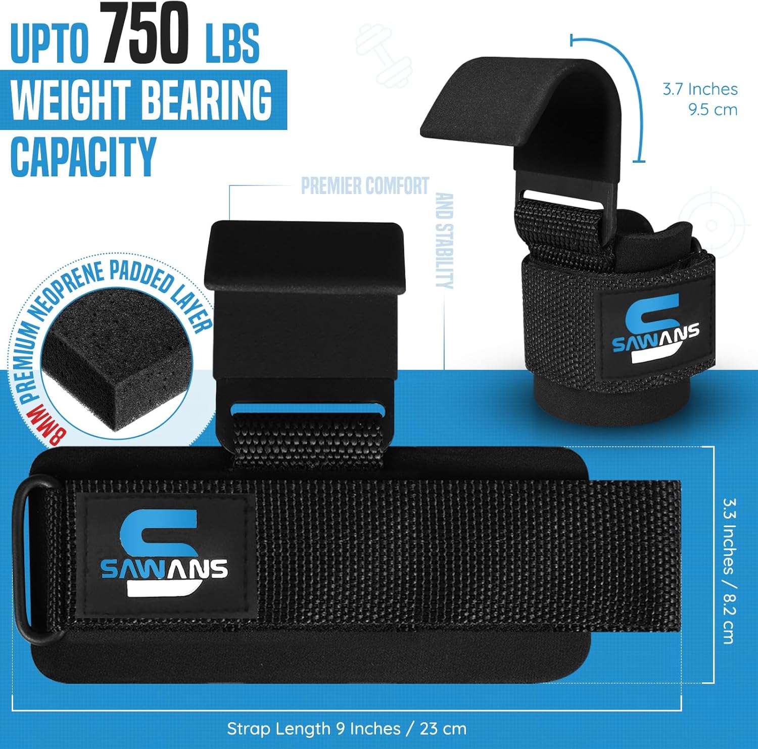 SAWANS Weight Lifting Hooks Thick Padded Neoprene Rubber Coated Grips 8mm Wrist Support Pair of Lifting Straps with Hooks Fitness Training Straps Power Weightlifting Deadlifts Exercise